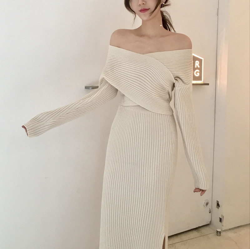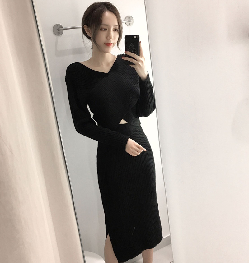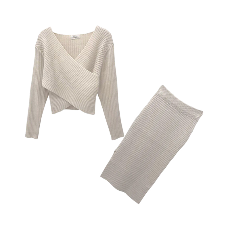 2018秋裝新款V領毛衣時尚交叉高腰半身短裙A字裙顯瘦針織毛衣套裝