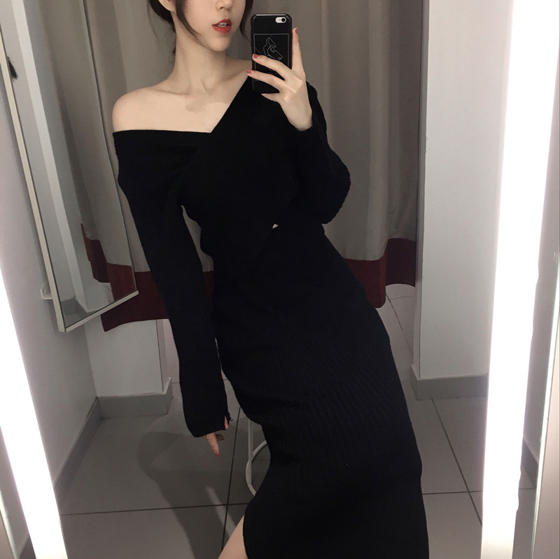 / 2018秋裝新款V領毛衣時尚交叉高腰半身短裙A字裙顯瘦針織毛衣套裝