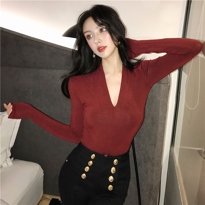 / 2018秋冬新款韓版上衣女百搭純色chic風加厚v領顯瘦修身打底T恤潮