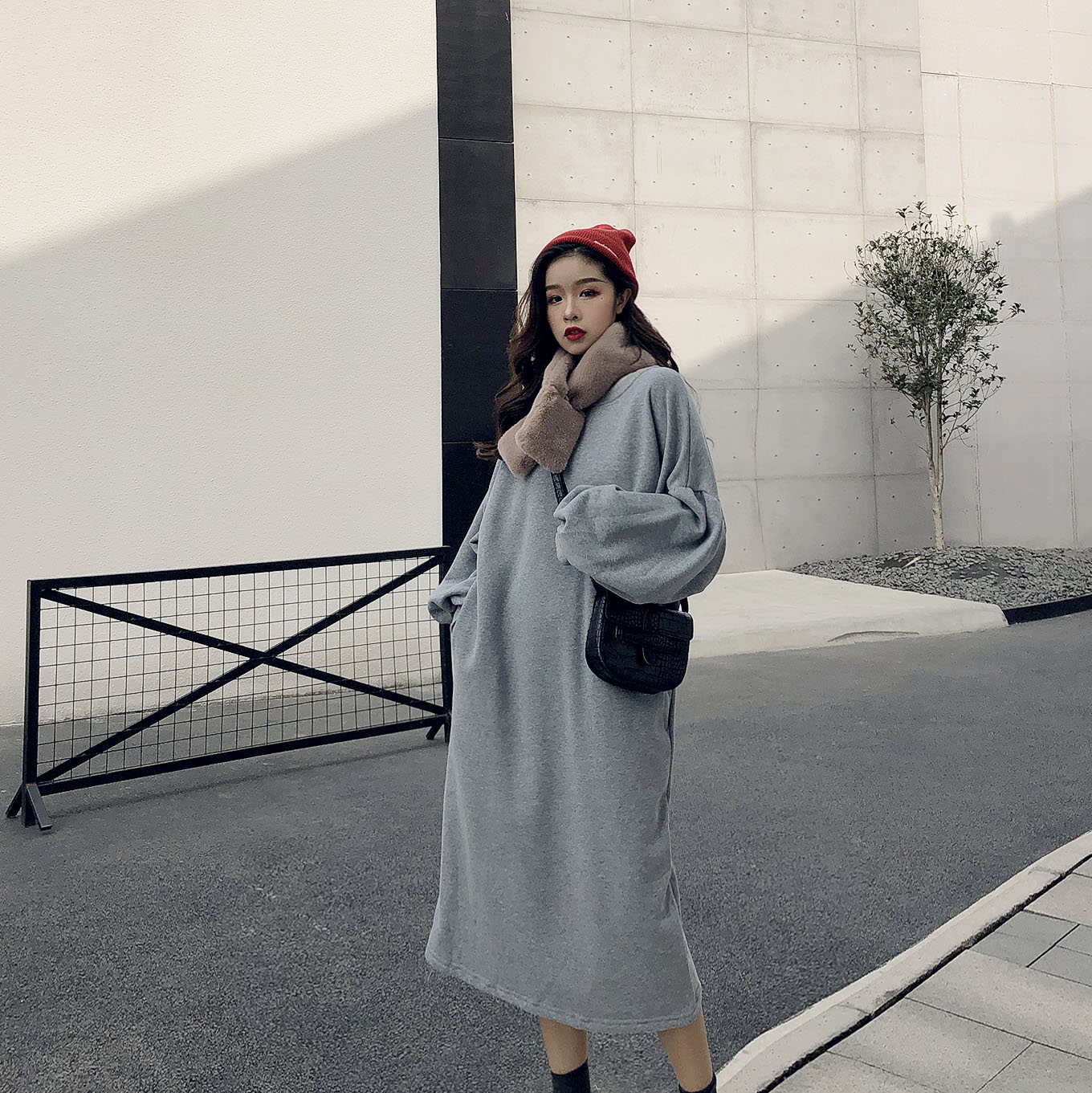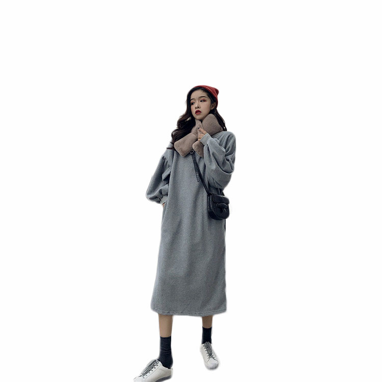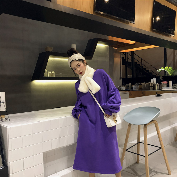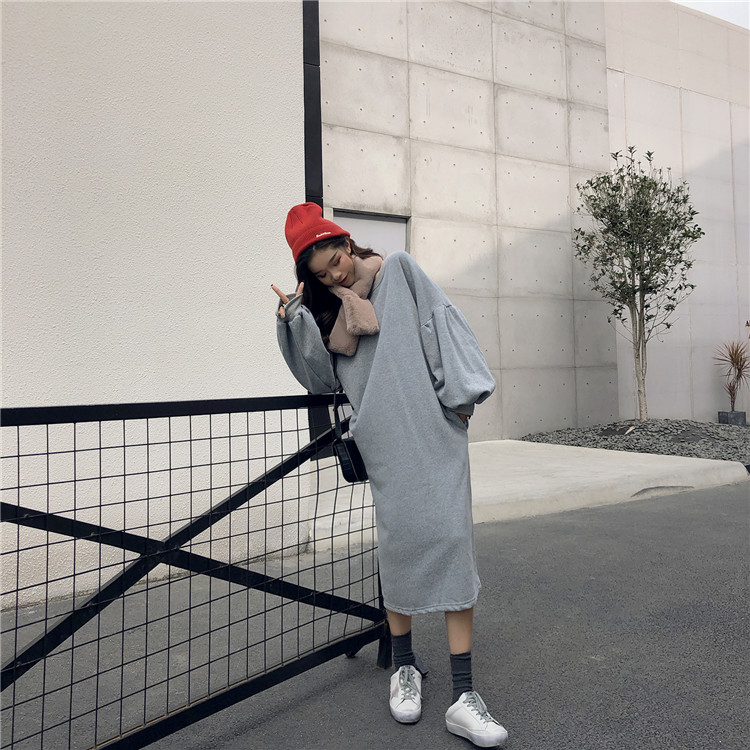 / 復古韓國chic泡泡袖慵懶風長款寬松顯瘦百搭加絨衛衣裙女2018新款