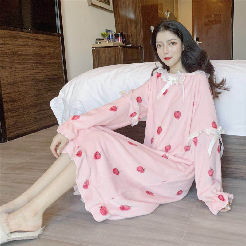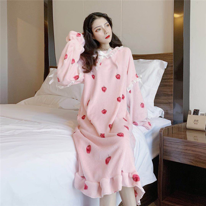 秋冬蝴蝶結新款甜美親膚舒適法蘭絨荷葉邊睡衣睡裙家居服連衣裙女