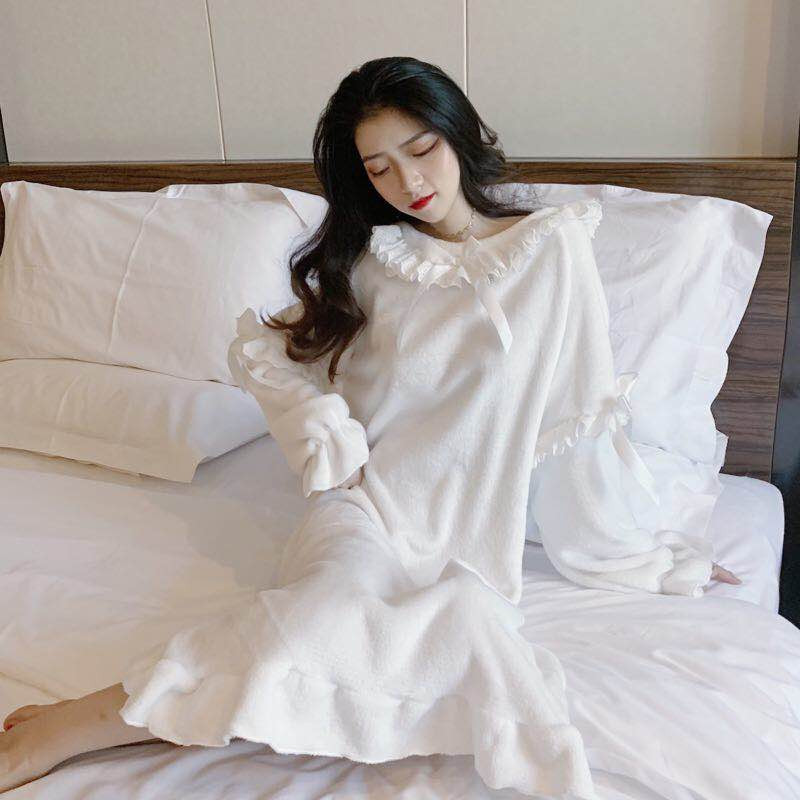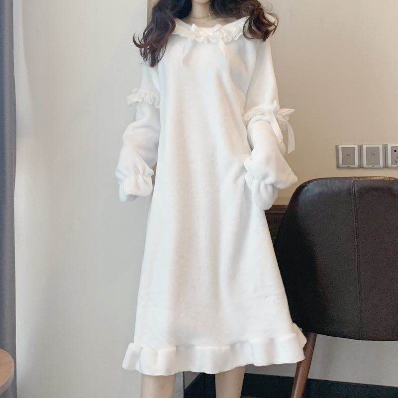 / 秋冬蝴蝶結新款甜美親膚舒適法蘭絨荷葉邊睡衣睡裙家居服連衣裙女