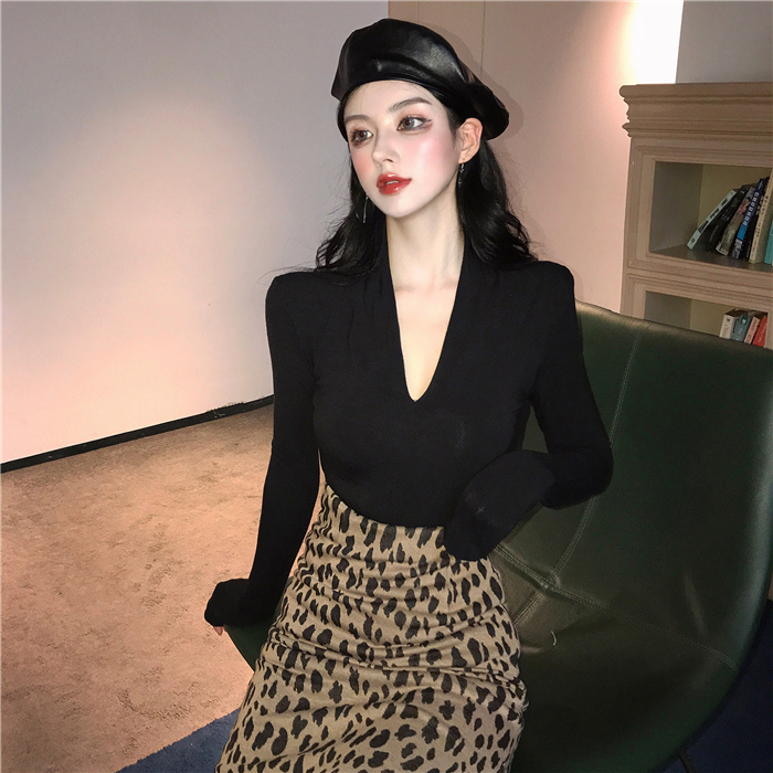 復古冬裝上衣女慵懶長袖t袖女百搭加厚純棉氣質v領顯瘦修身打底衫