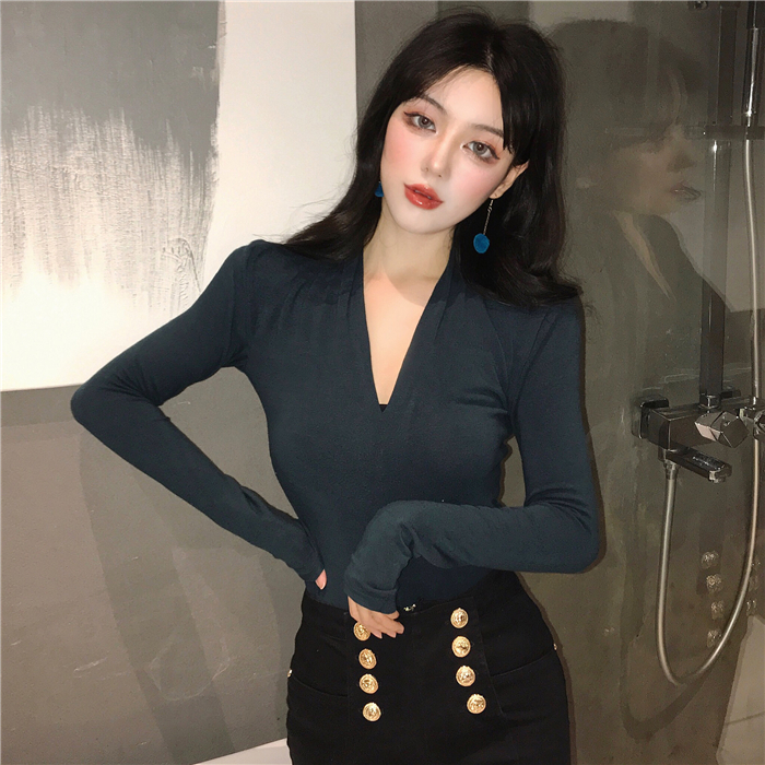 / 復古冬裝上衣女慵懶長袖t袖女百搭加厚純棉氣質v領顯瘦修身打底衫