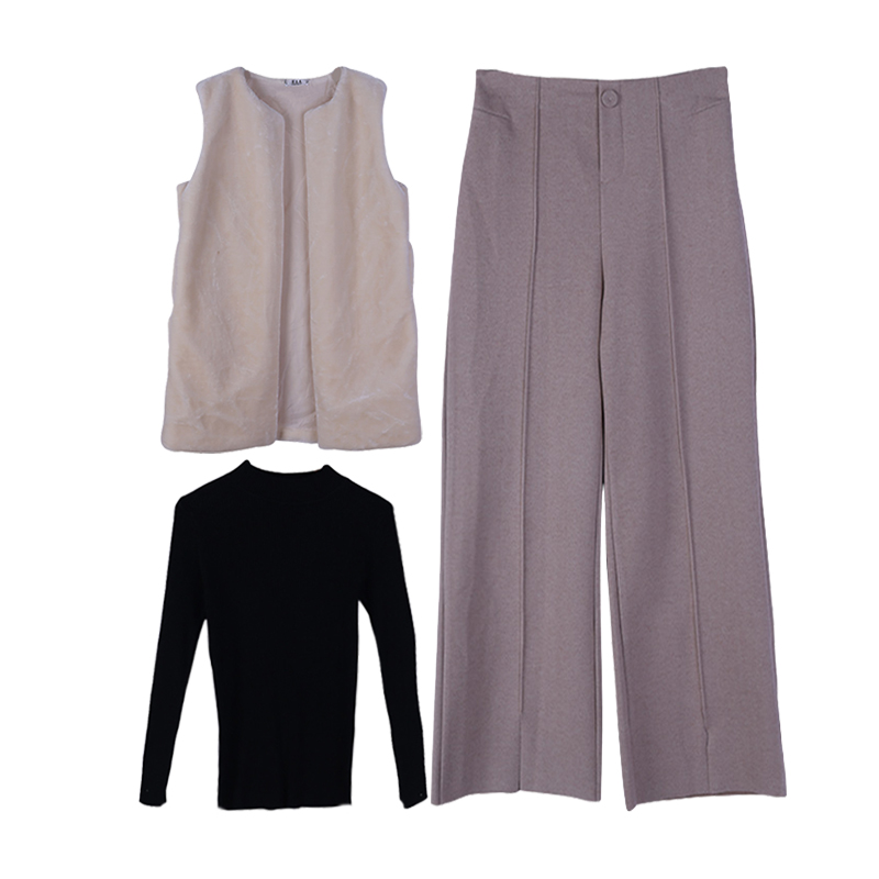 新款毛毛長款馬甲百搭打底針織衫上衣高腰闊腿長褲時尚套裝三件套