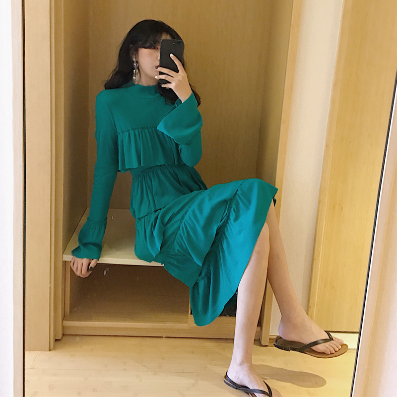 / 港味復古半高領喇叭袖層層蛋糕裙高腰連衣裙女甜美百搭chic中長裙