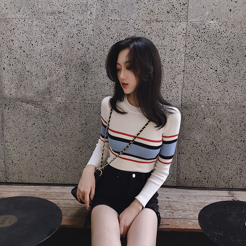 chic早秋上衣女2018新款韓版百搭套頭條紋長袖打底針織衫毛衣潮