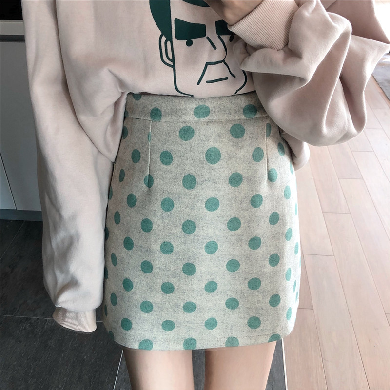 chic港味裙子女秋冬2018新款時尚復古百搭顯瘦波點毛呢短裙半身裙