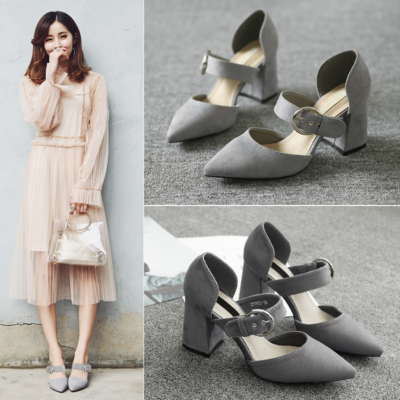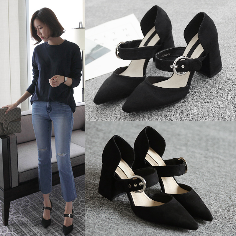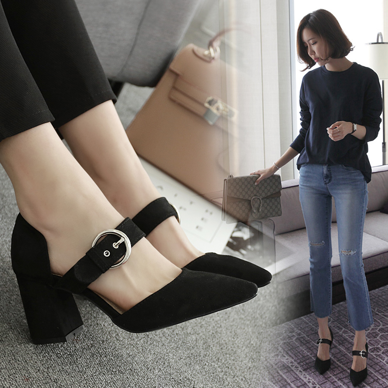 / 春夏季單鞋女新款百搭一字扣淺口尖頭高跟鞋粗跟中跟女士鞋子