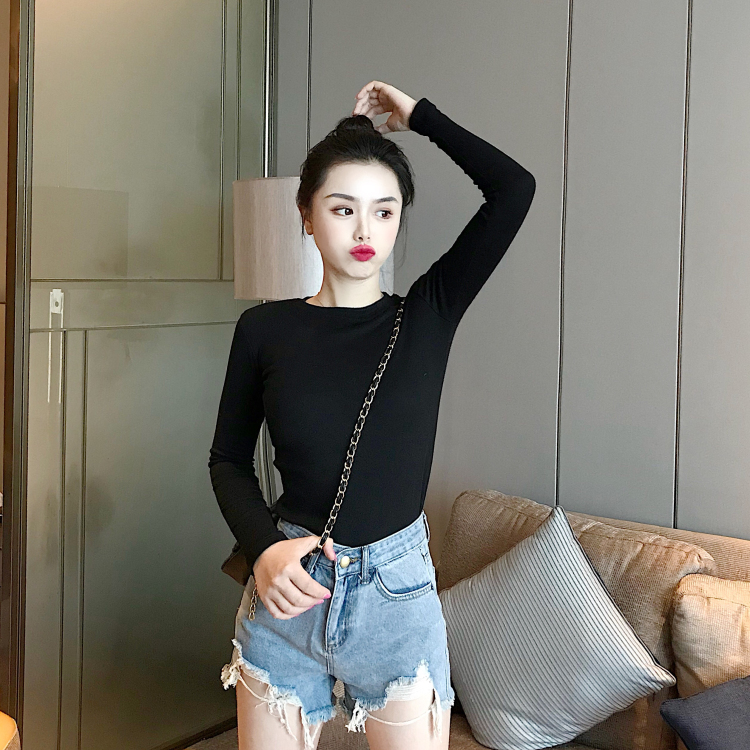 / chic早秋上衣女新款韓版復古百搭圓領修身打底高腰長袖磨毛T恤潮