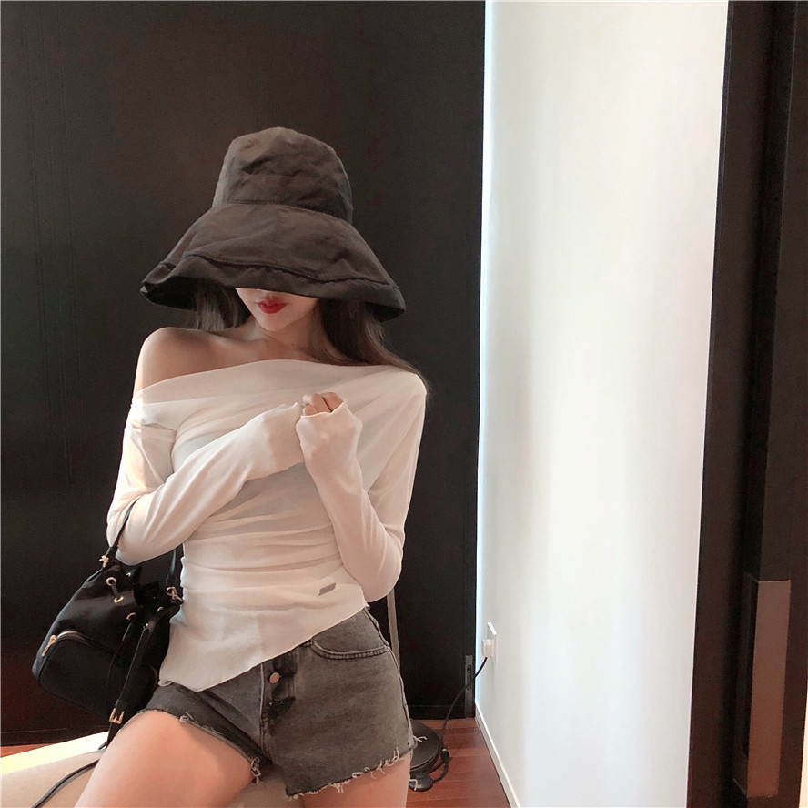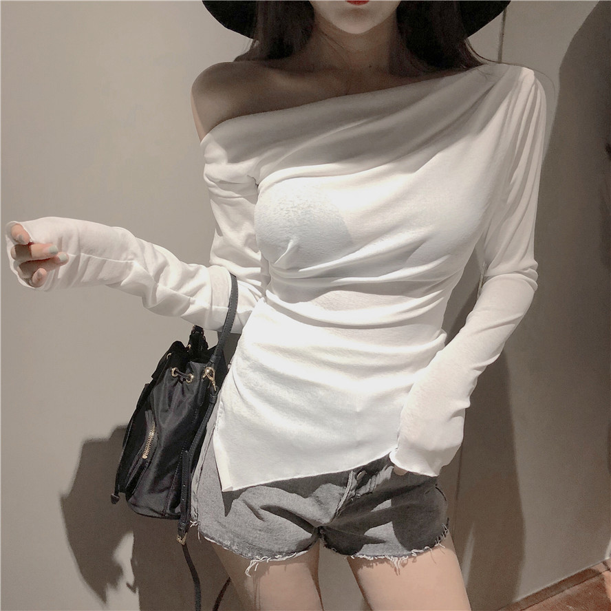 / 2018早秋新款百搭chic一字肩領上衣小心機露肩長袖T恤內搭打底衫
