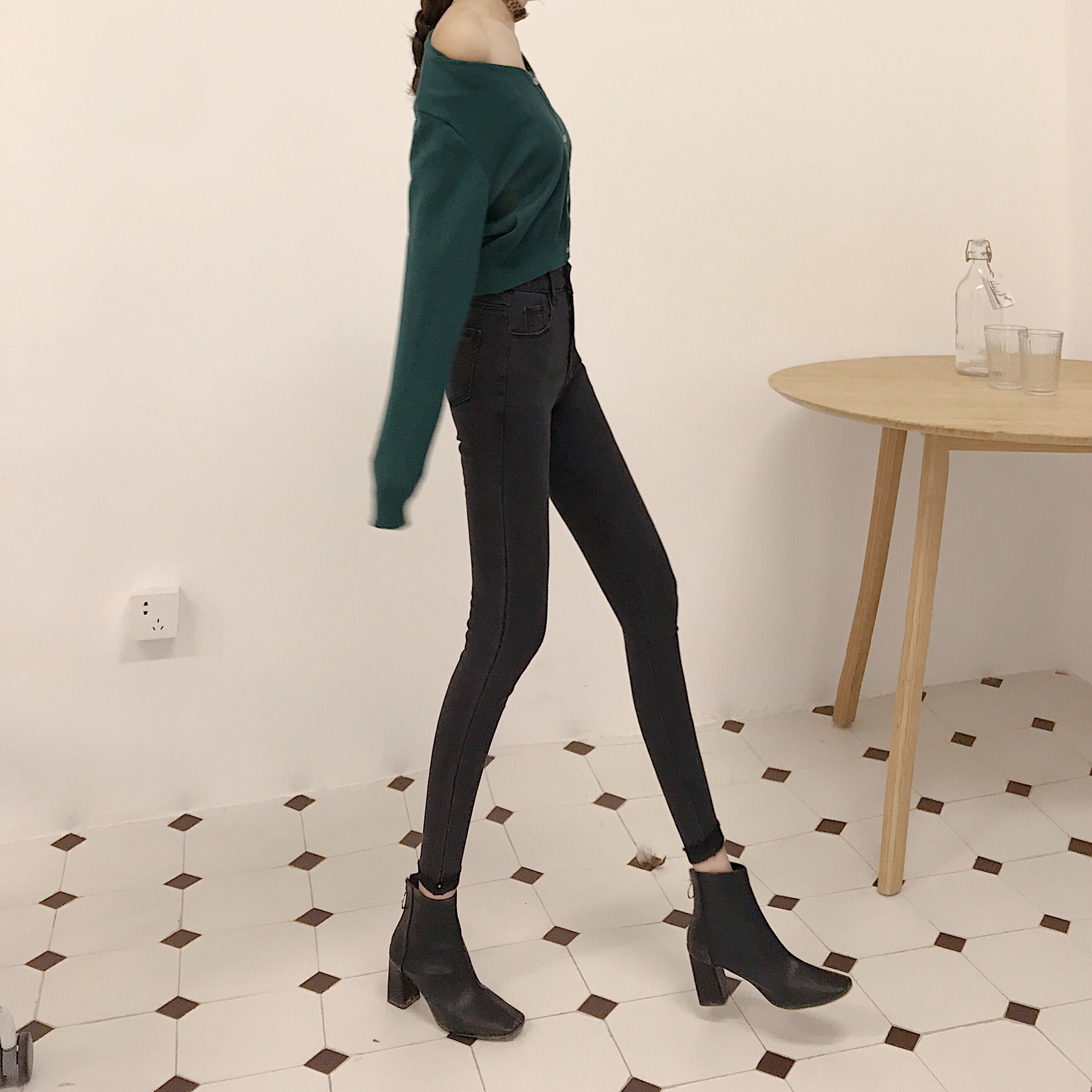 韓國chic風時尚釘珠顯瘦小腳鉛筆褲修身彈力加薄絨九分牛仔褲女潮