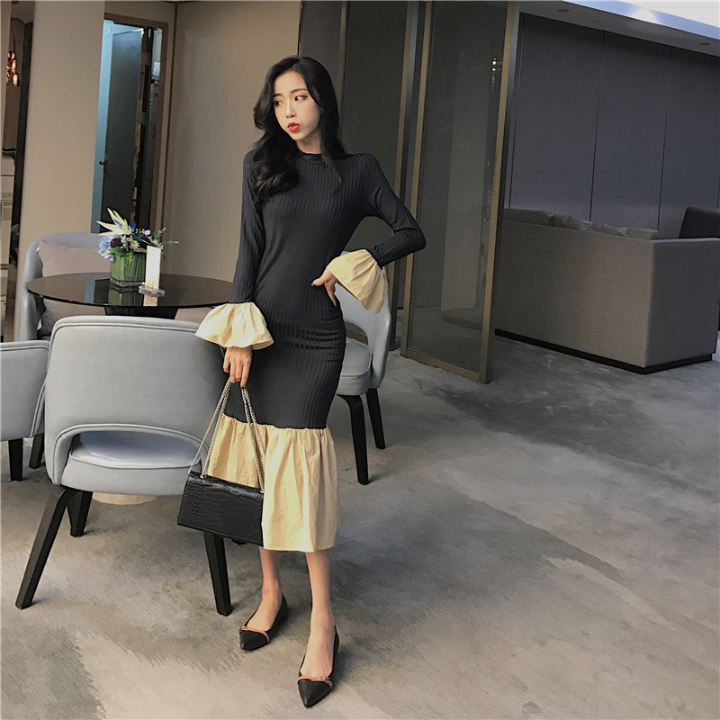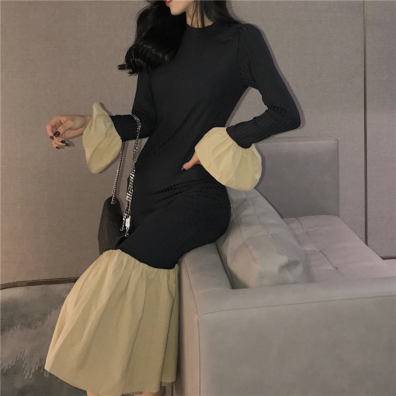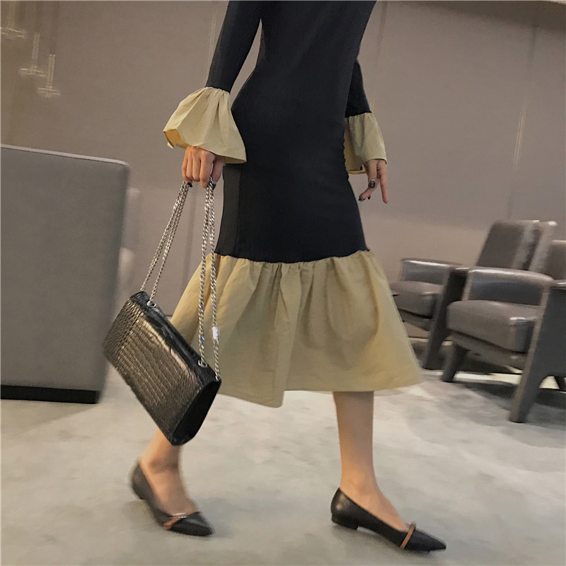 晚晚風秋季新款修身顯瘦高領喇叭袖針織拼接荷葉邊chic風連衣裙女