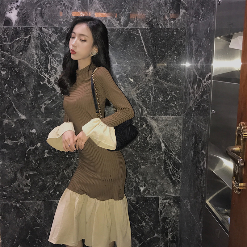 / 晚晚風秋季新款修身顯瘦高領喇叭袖針織拼接荷葉邊chic風連衣裙女