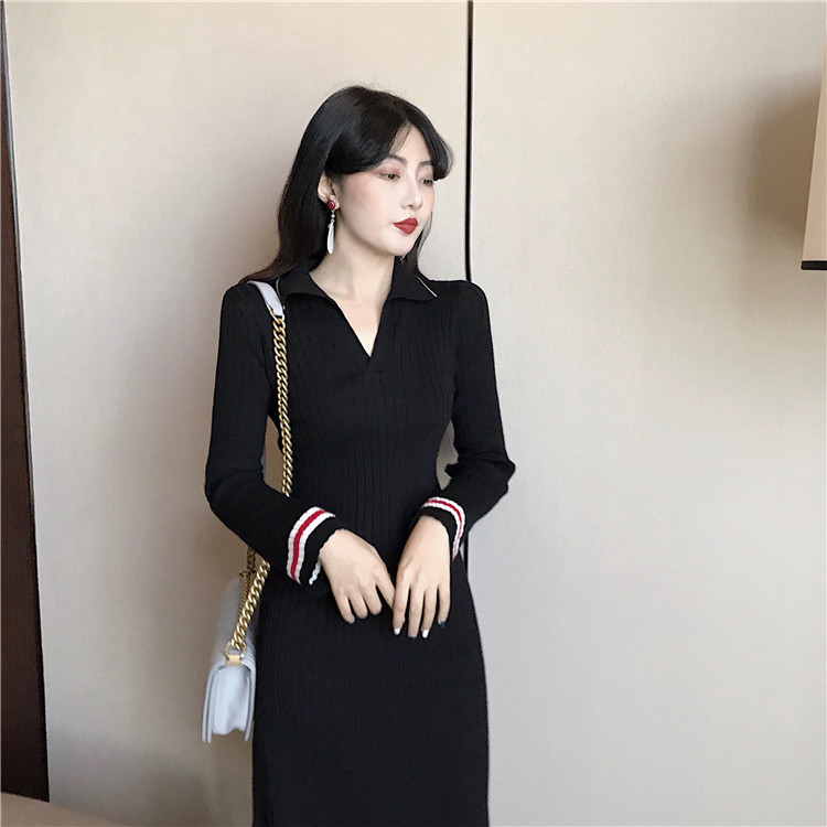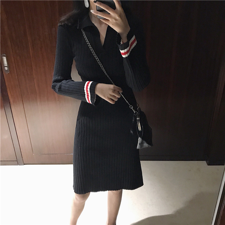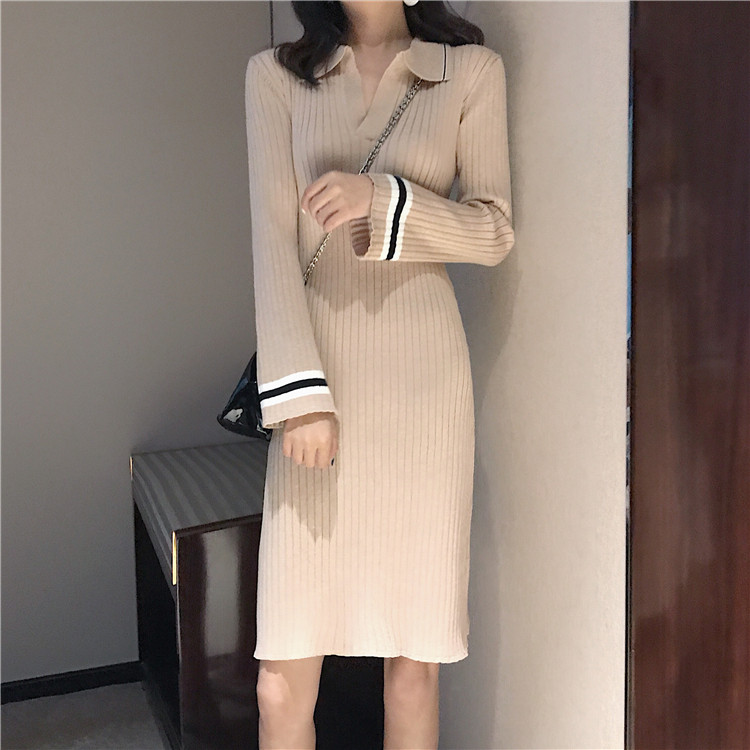修身收腰套頭中長款氣質喇叭袖打底針織連衣裙女韓版2018新款秋季