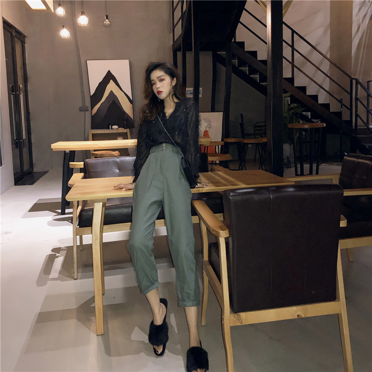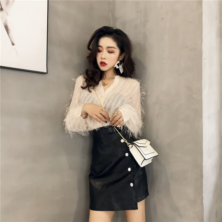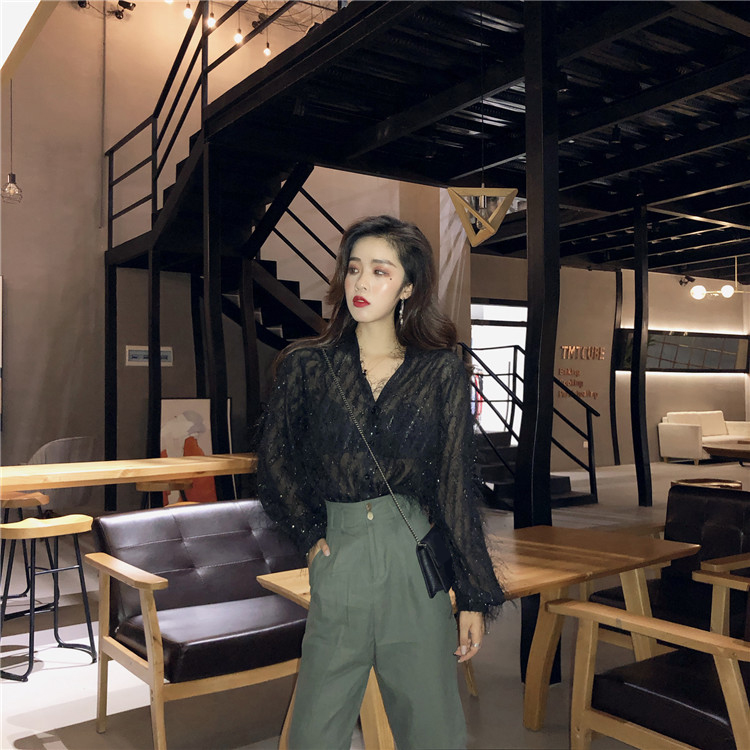 / 2018復古溫柔V領泡泡袖亮絲微透襯衫清時尚百搭毛毛上衣女裝秋潮