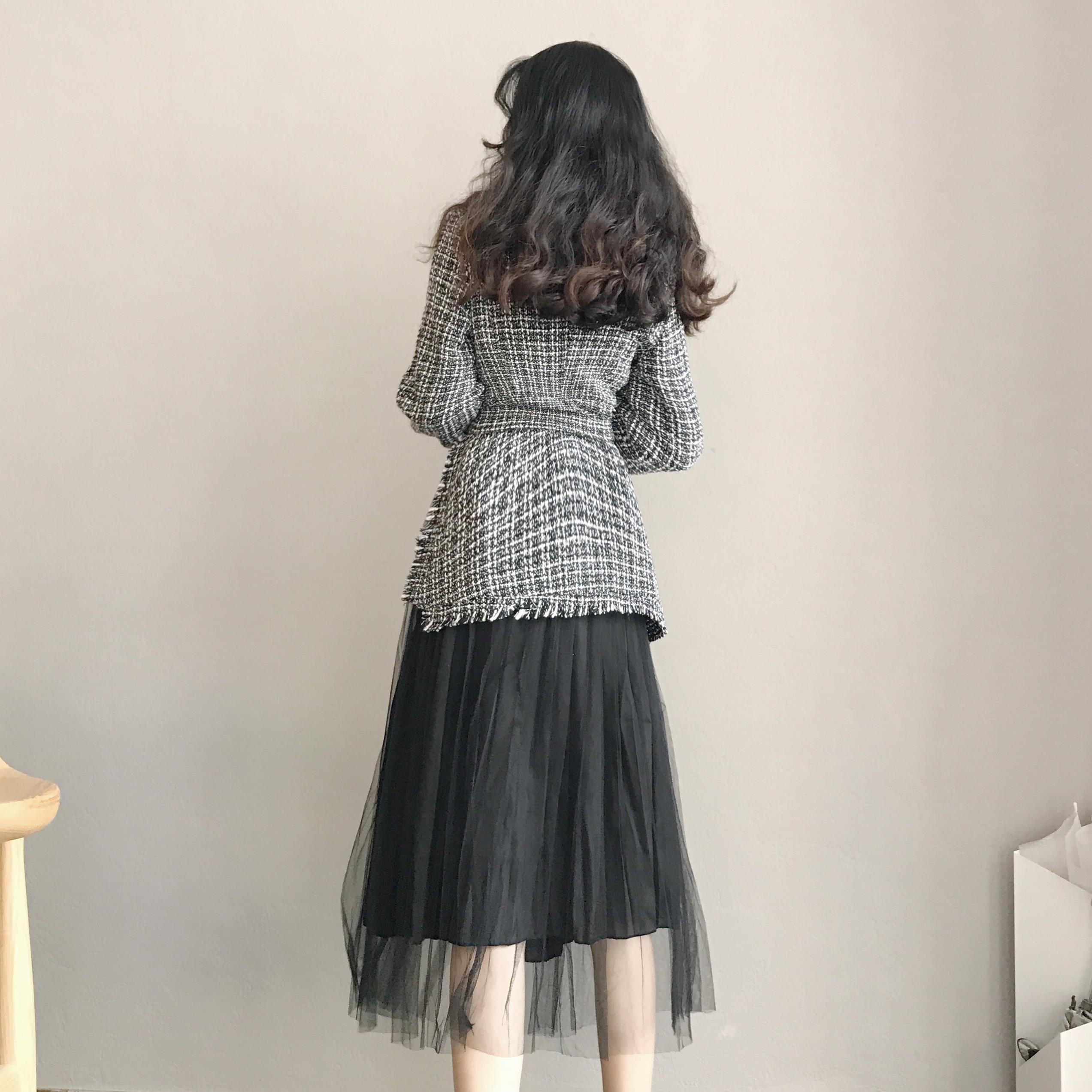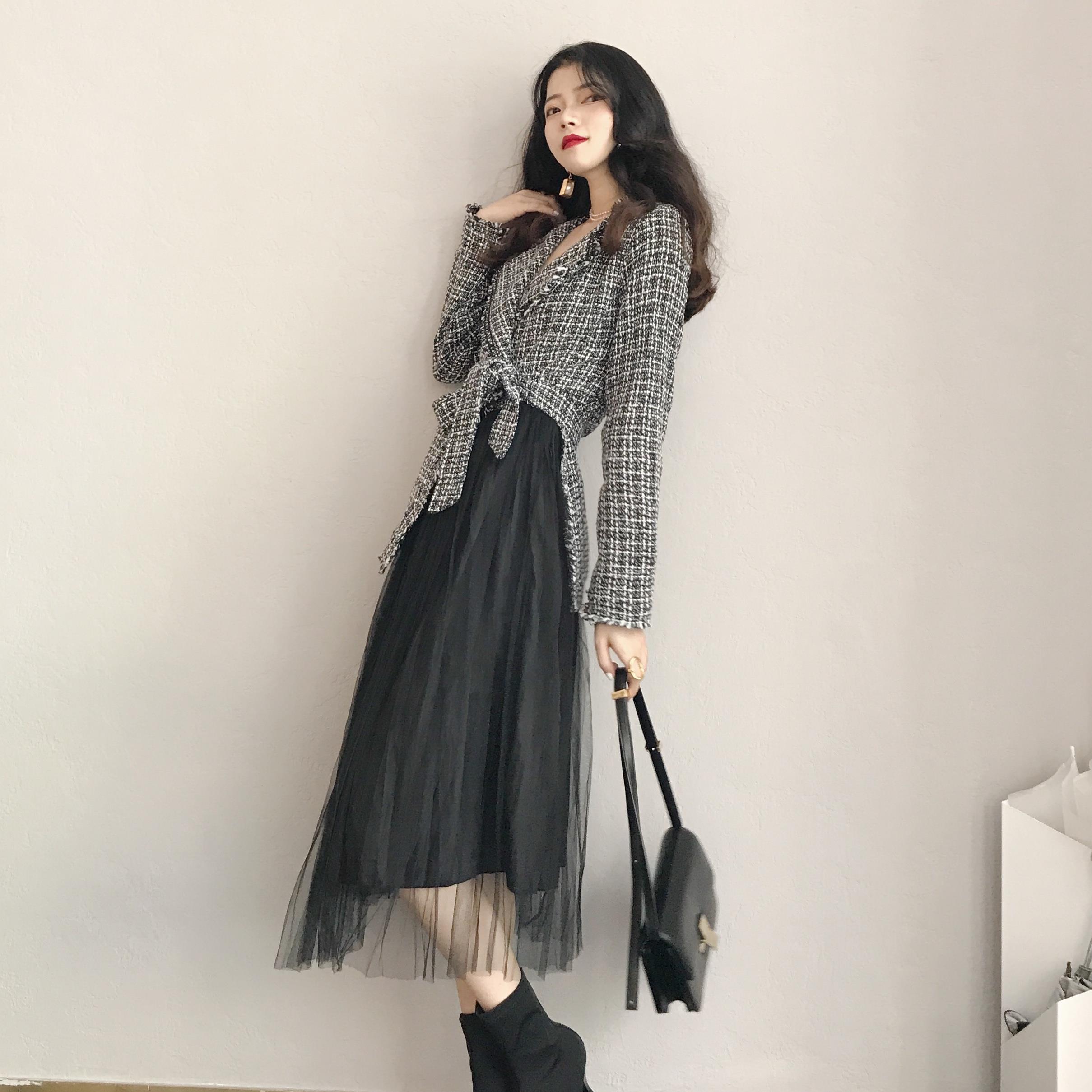 / 秋季新款時尚設計感氣質chic韓版西裝外套拼接網紗假兩件連衣裙潮