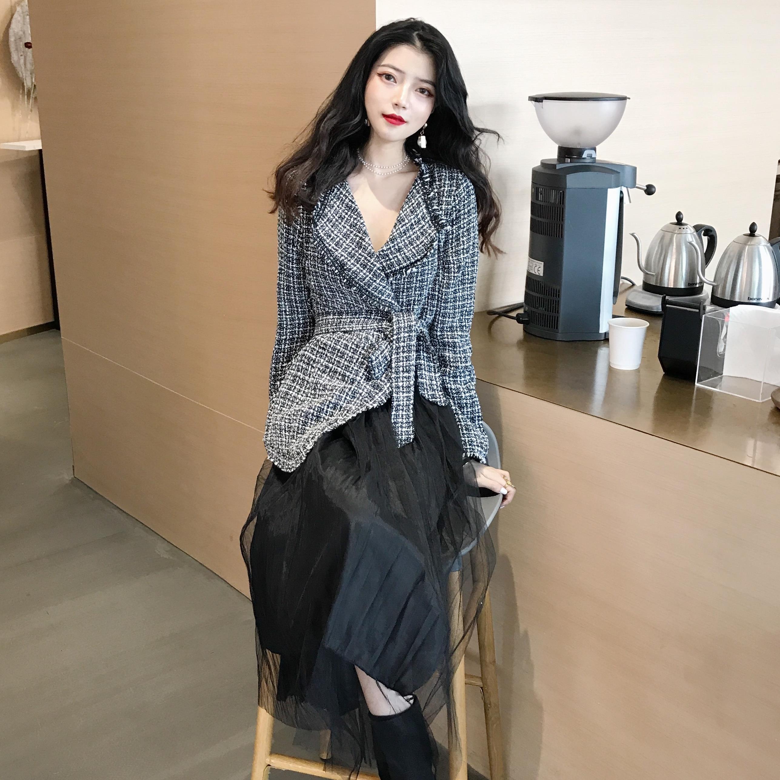 秋季新款時尚設計感氣質chic韓版西裝外套拼接網紗假兩件連衣裙潮