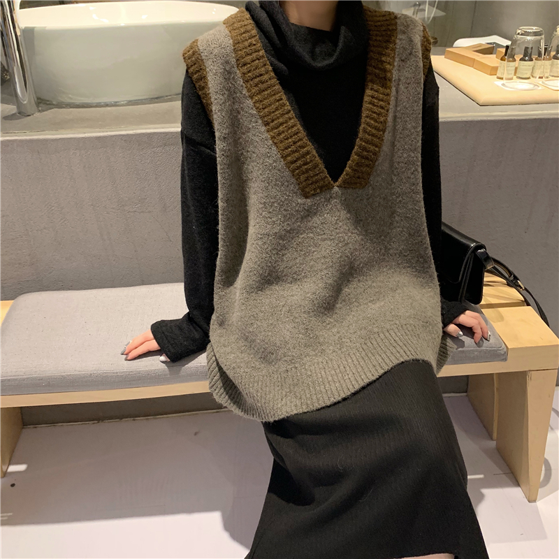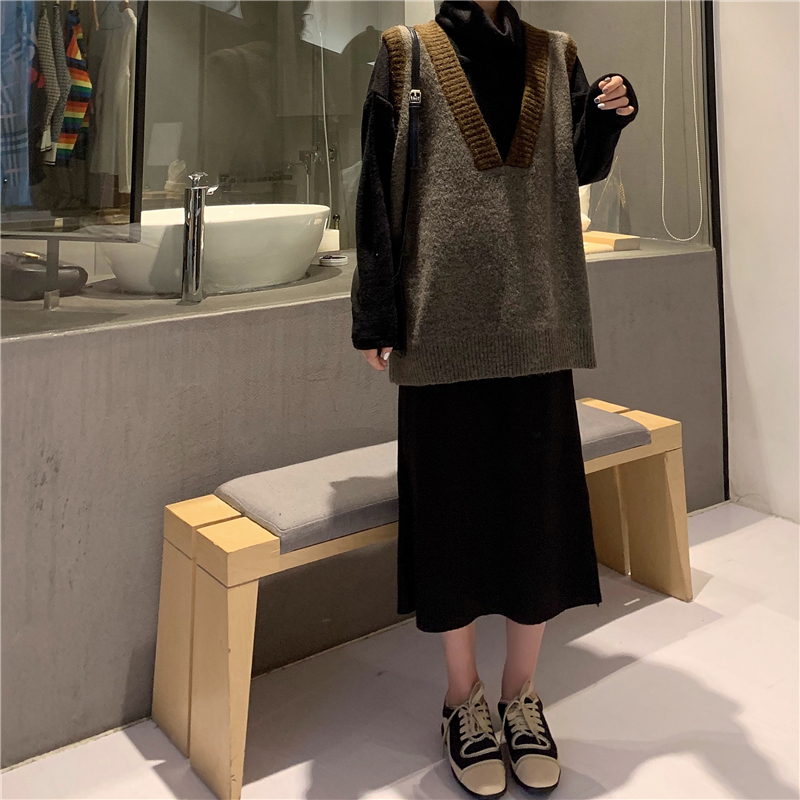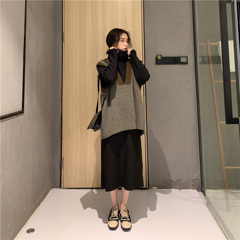 / 港味復古chic新款韓版時尚套裝撞色V領馬甲高領毛衣呢子半身長裙
