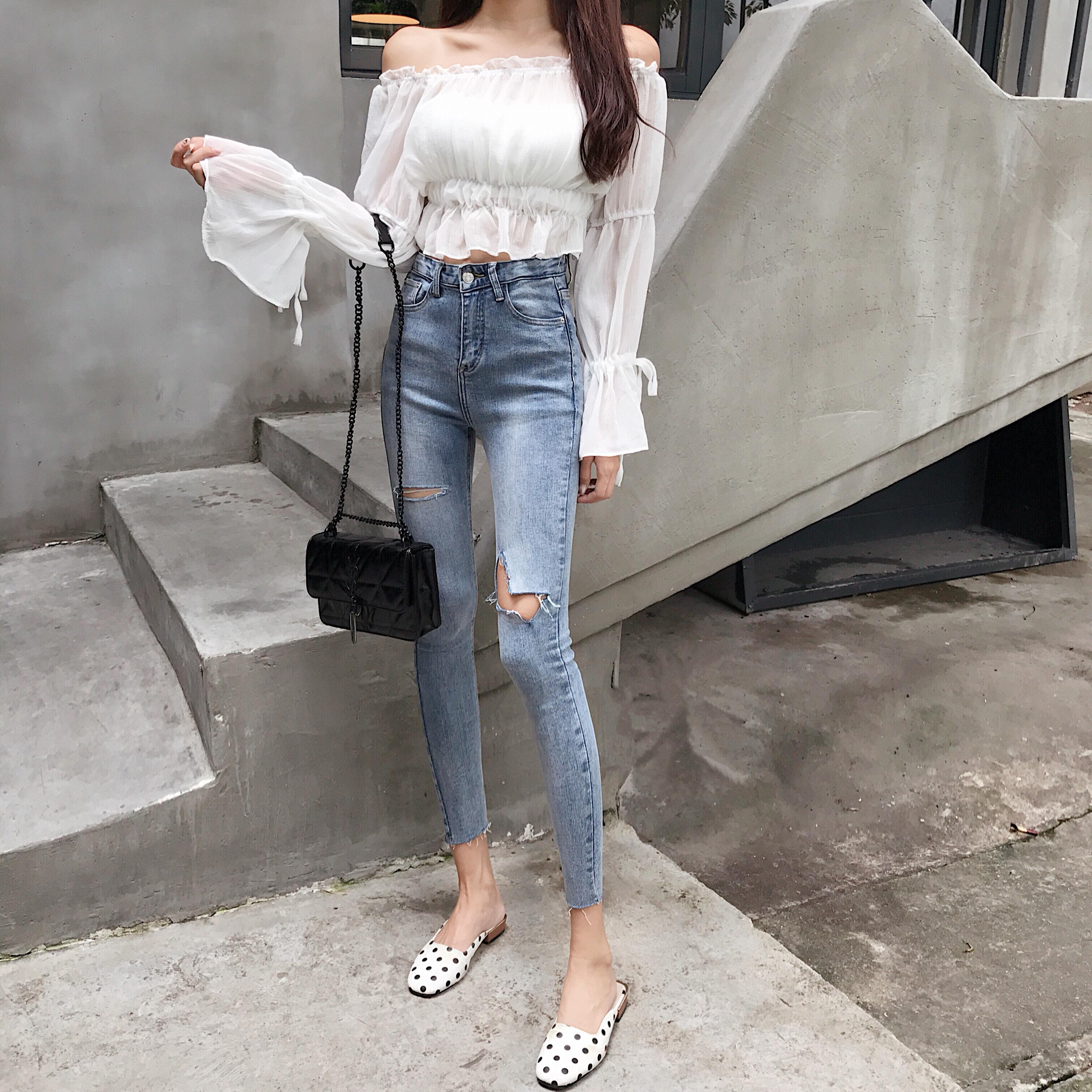 褲子女2018秋裝韓版新款修身顯瘦小腳彈力鉛筆褲百搭破洞牛仔褲潮