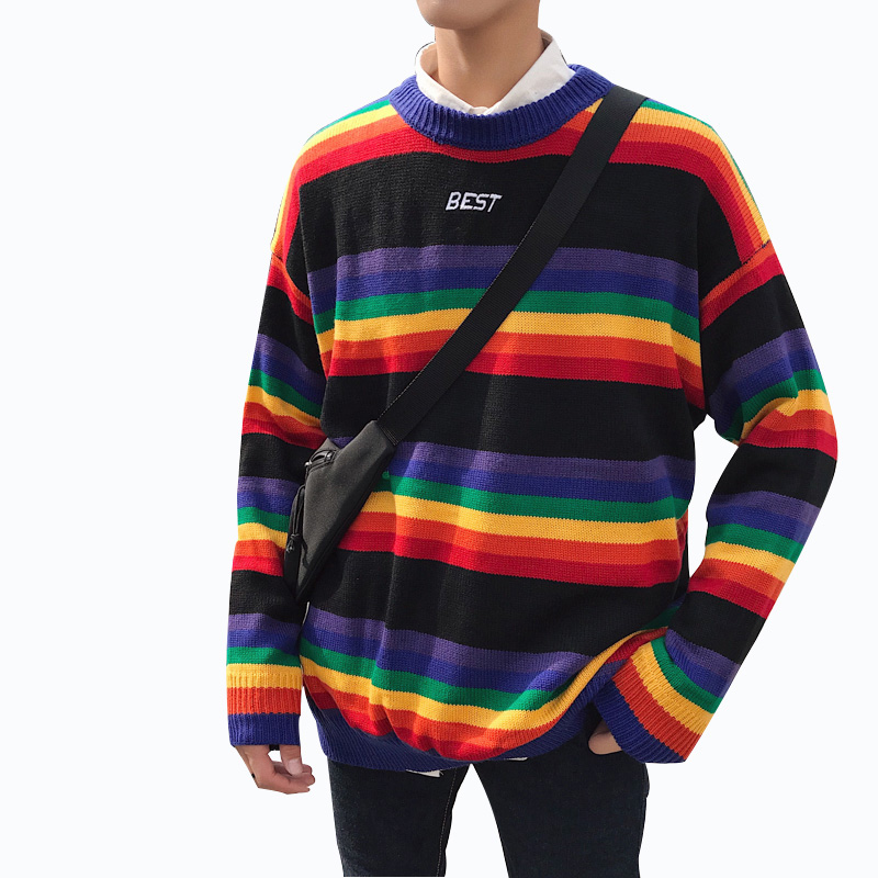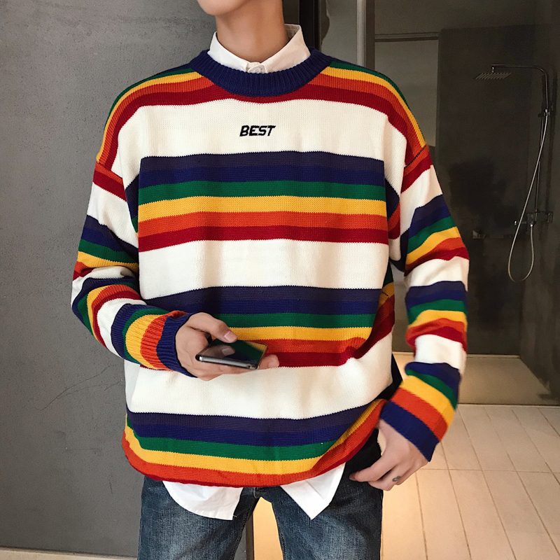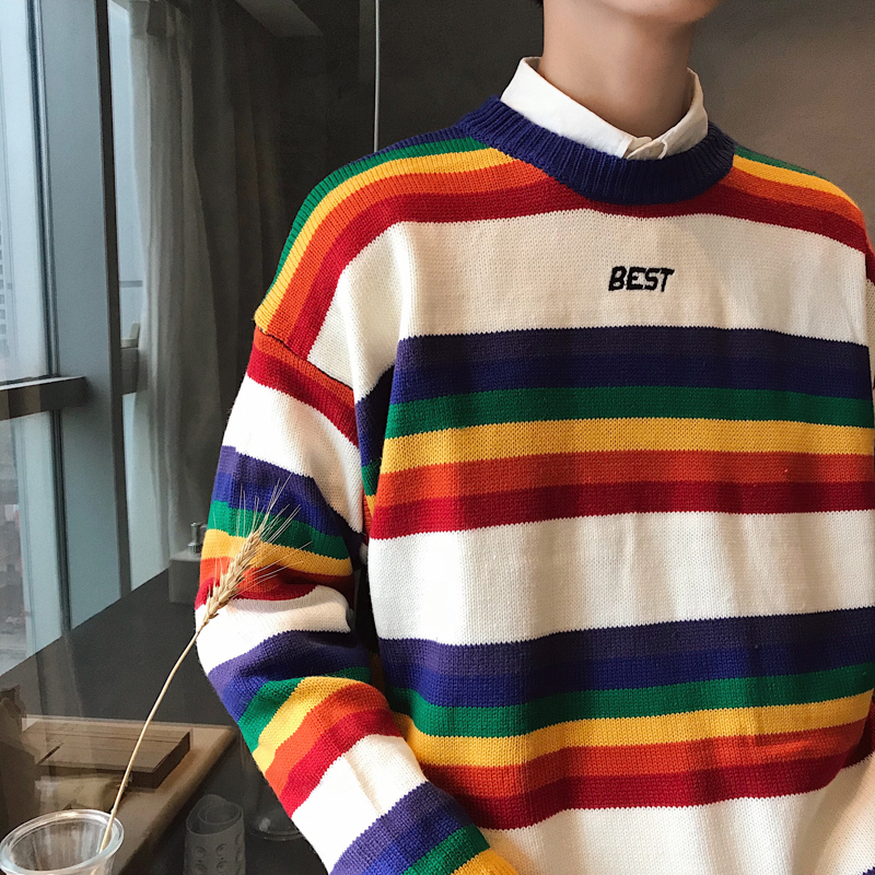 文藝男女店彩虹條紋套頭男士粗線毛衣韓版潮流男裝針織衫冬季外套