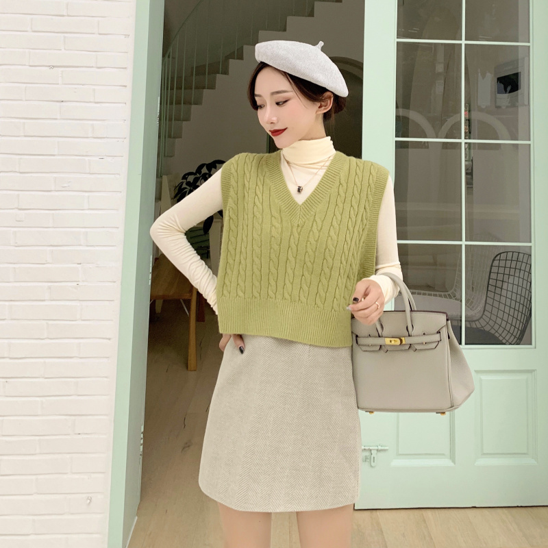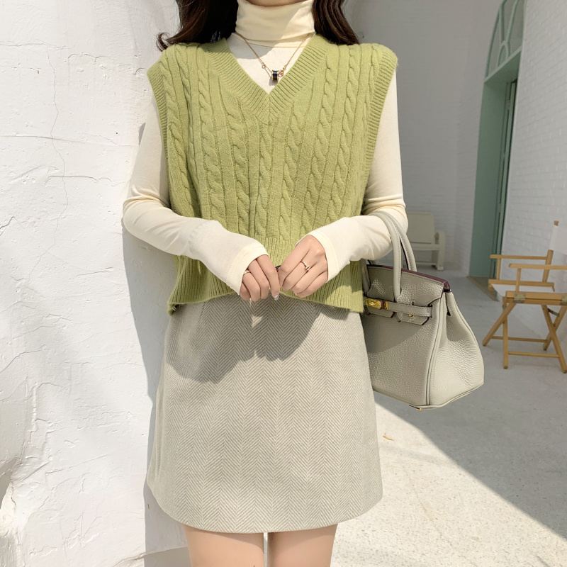 綠色馬甲|杏色打底衫|毛呢半身裙