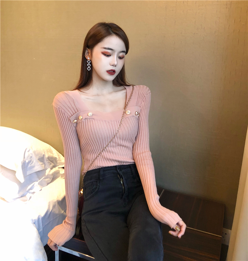 / 秋裝新款韓版chic復古百搭時尚打底衫港風修身顯瘦紐扣針織上衣女