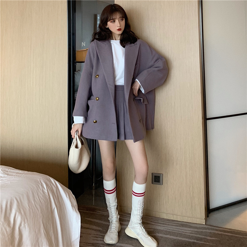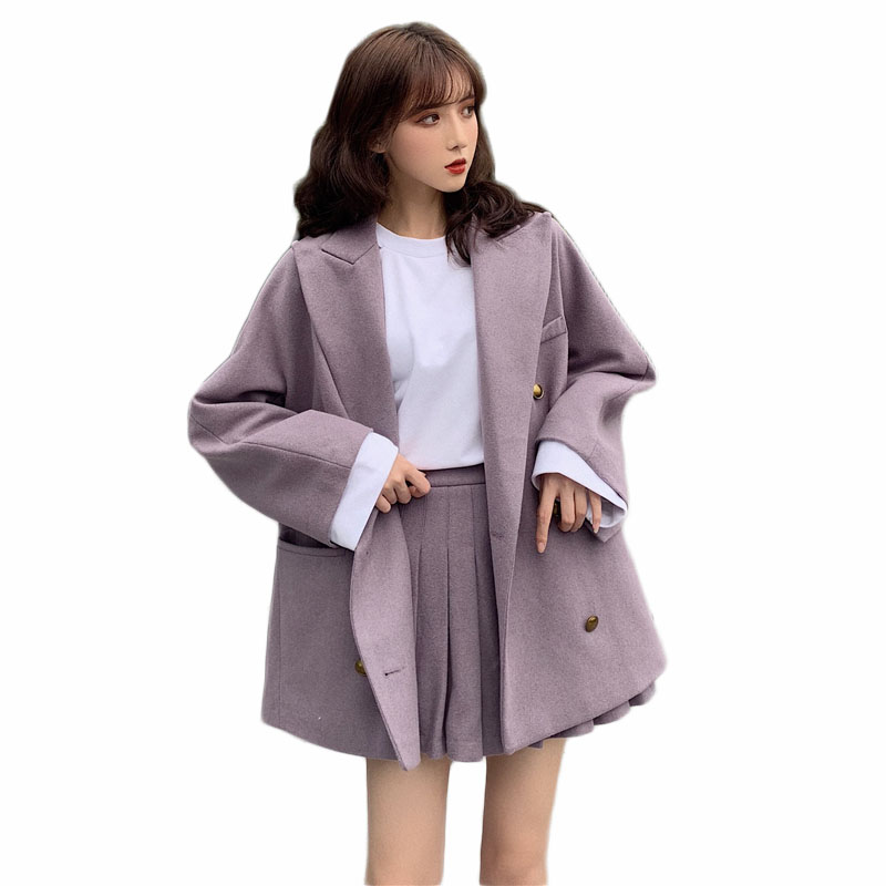 復古雙排扣呢子大衣毛呢外套女秋冬2018新款潮+呢子百褶裙褲套裝