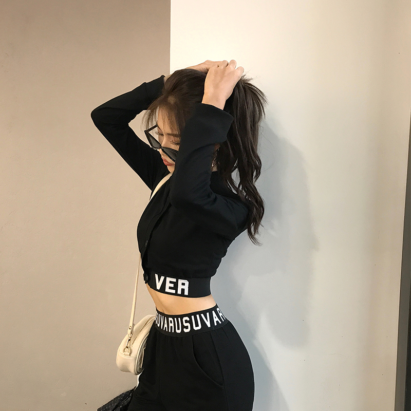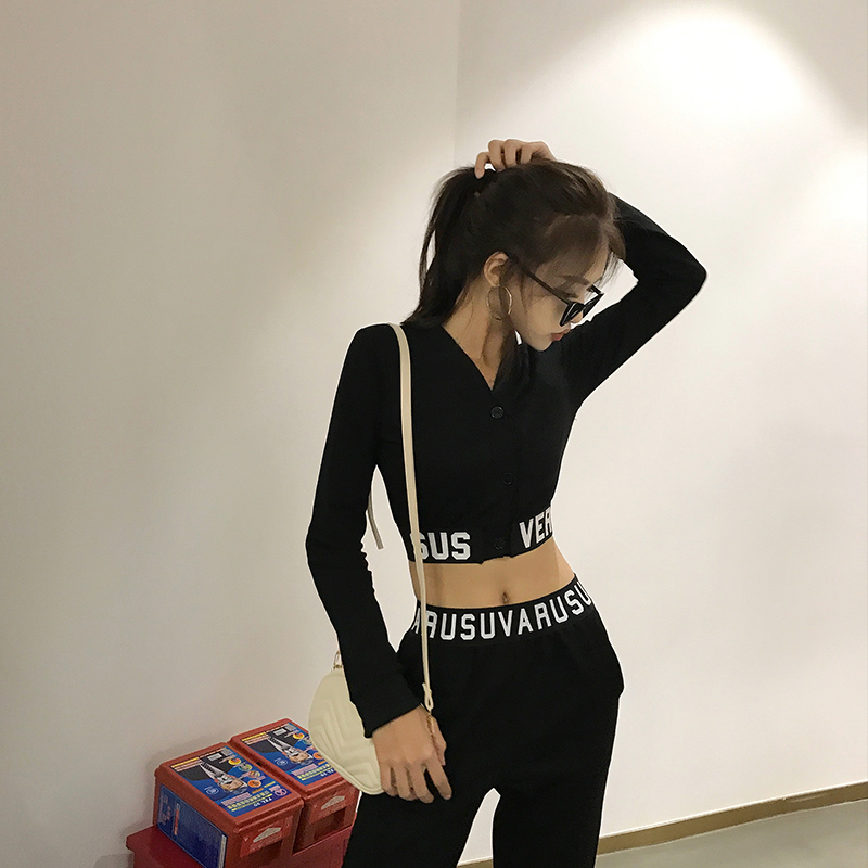 2018秋裝新款韓版休閑運動套裝短款V領露臍上衣高腰長褲兩件套女