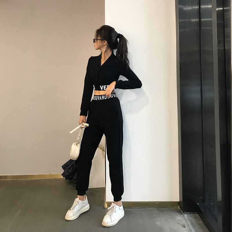 / 2018秋裝新款韓版休閑運動套裝短款V領露臍上衣高腰長褲兩件套女