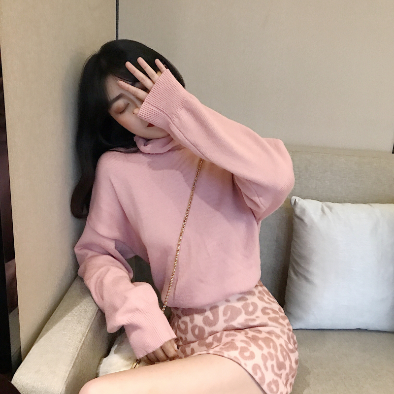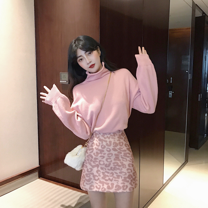 溫柔純色高領毛衣女針織衫上衣+豹紋半身裙暖冬a字包臀短裙兩件套