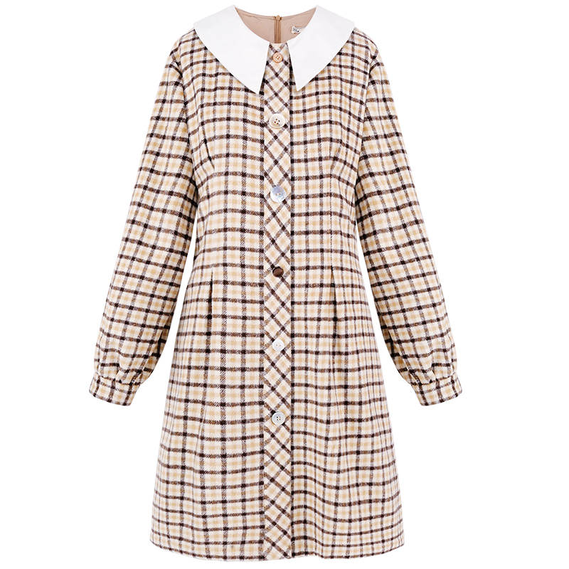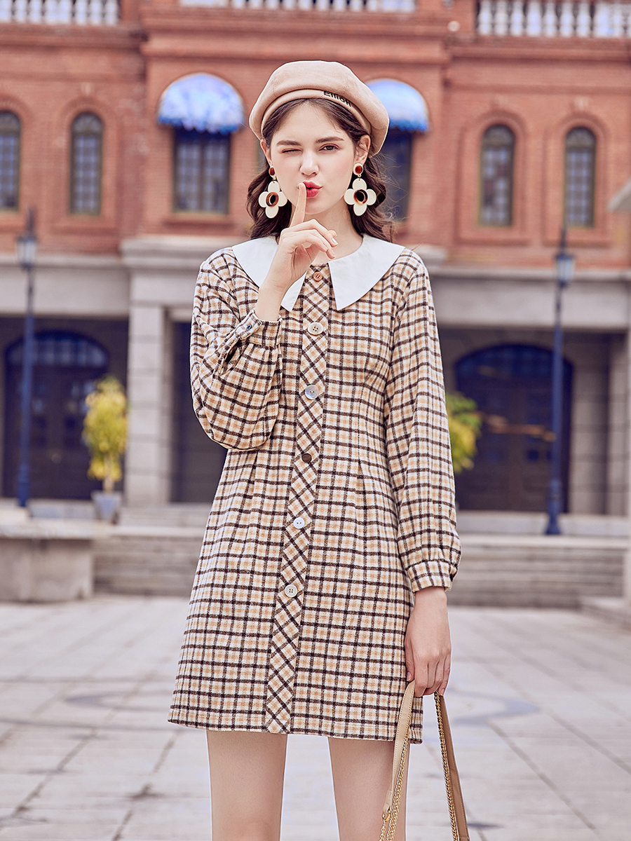 / MG小象長袖毛呢連衣裙女秋裝2018新款中長款學生收腰顯瘦格子裙子