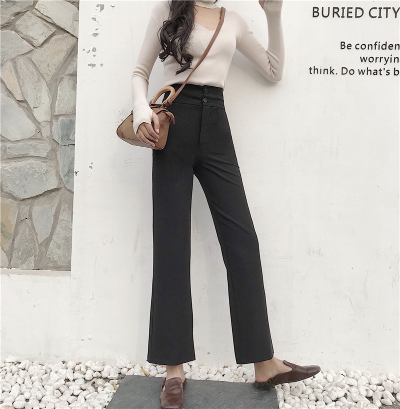 春季九分微喇叭褲高腰修身港味復古chic兩粒扣純色西裝休閑褲女潮