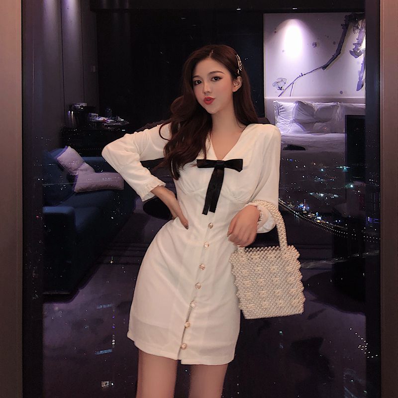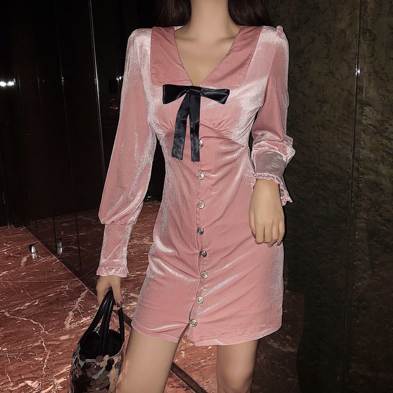 / 晚晚風新款韓版秋季女神范單排扣蝴蝶結收腰顯瘦長袖絲絨連衣裙潮