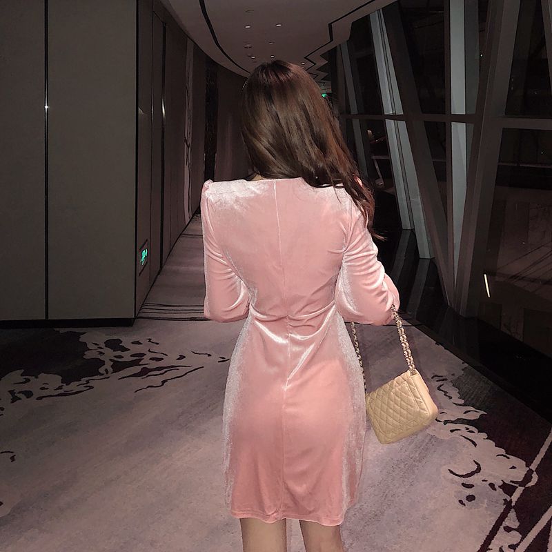 晚晚風新款韓版秋季女神范單排扣蝴蝶結收腰顯瘦長袖絲絨連衣裙潮