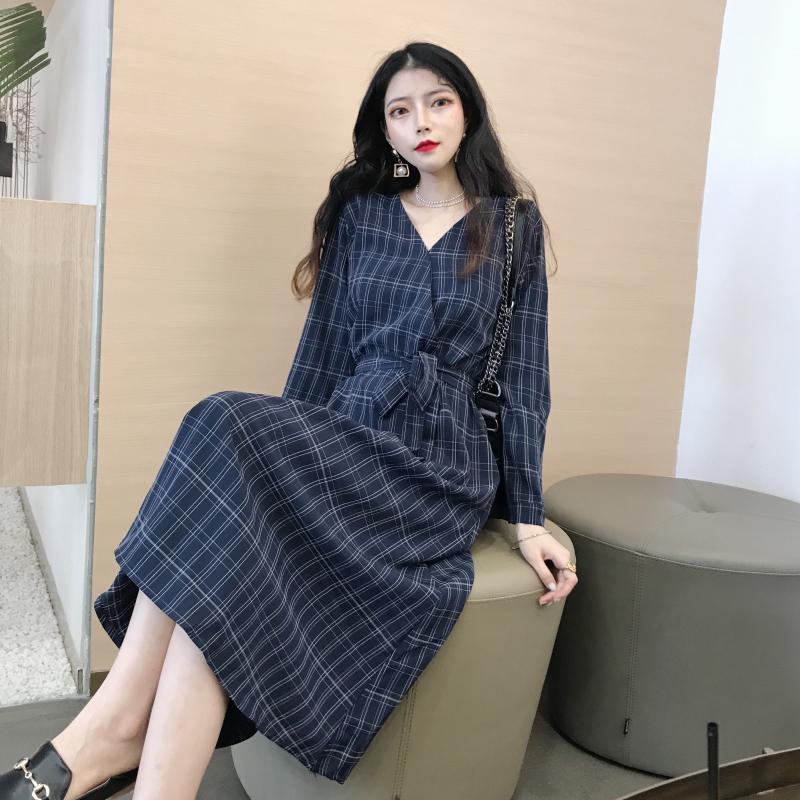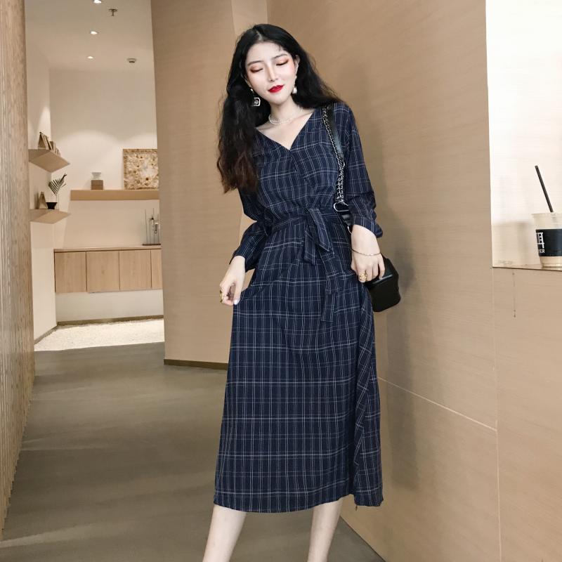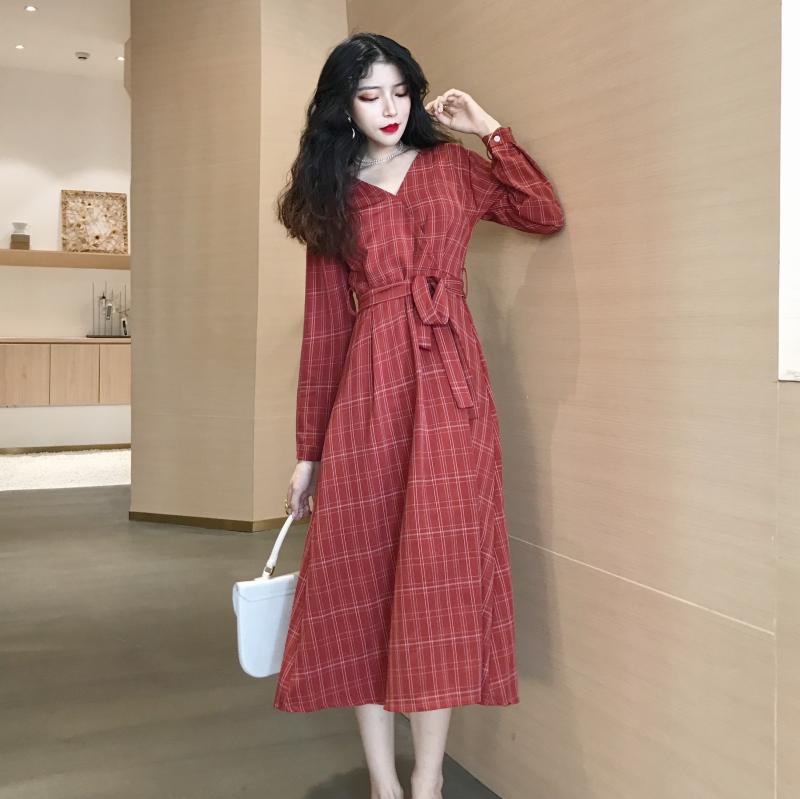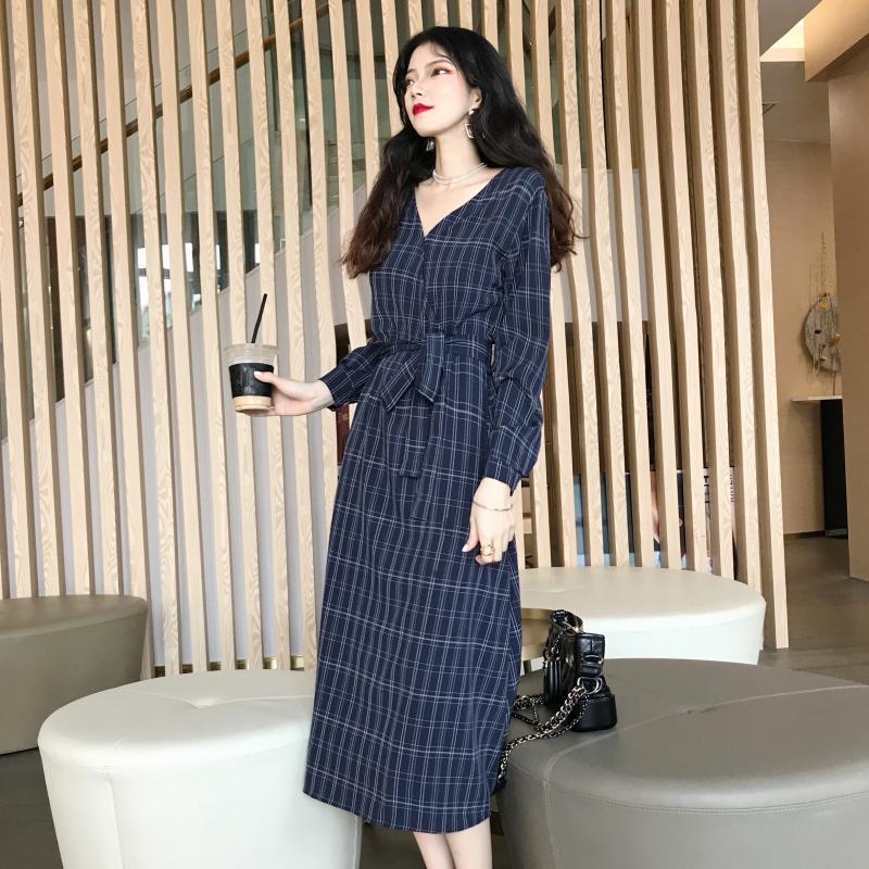 / 晚晚風秋季新款格子V領百搭chic時尚港味少女復古長裙連衣裙子潮