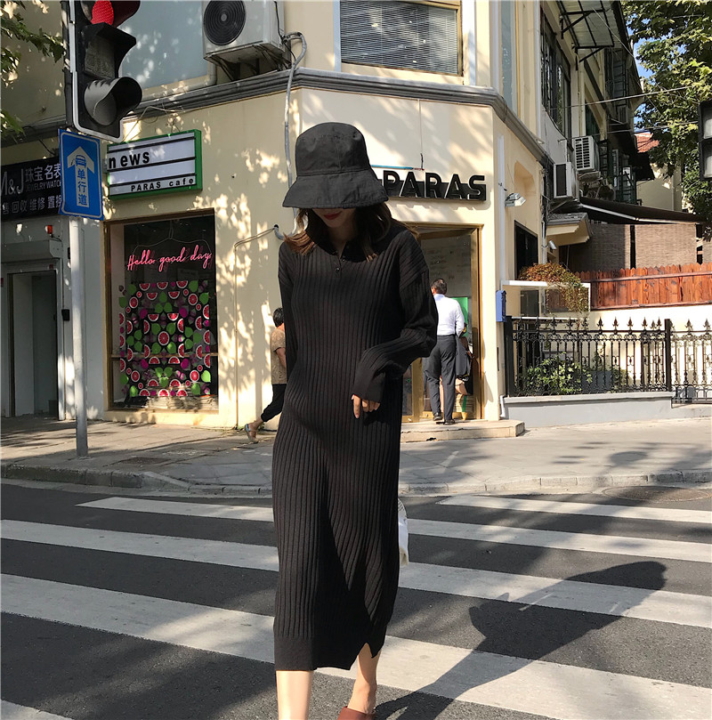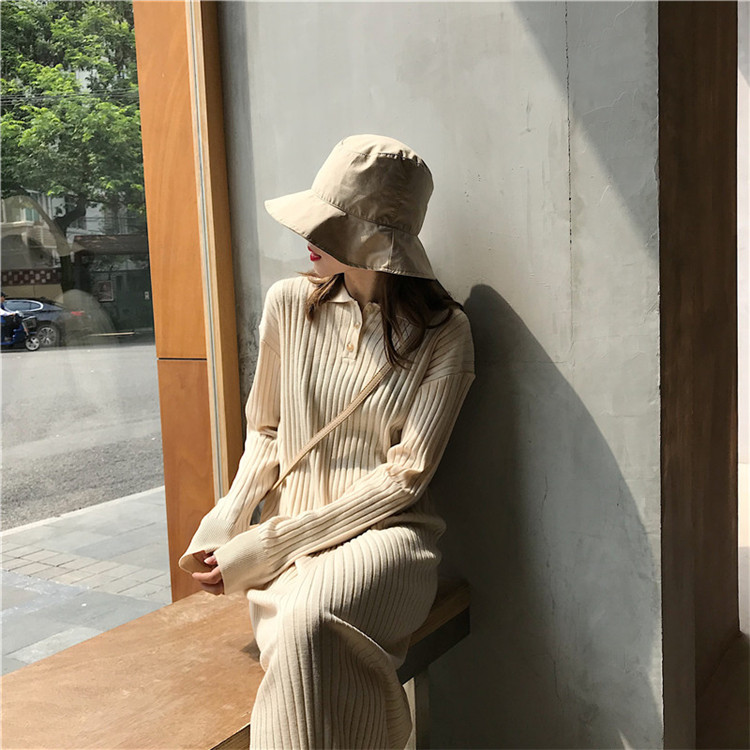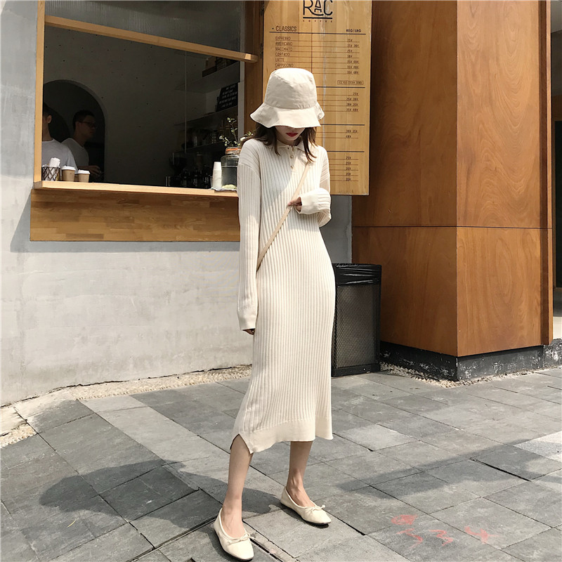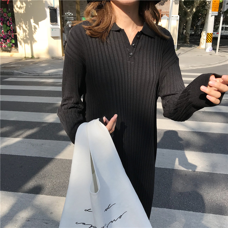 / 韓系慵懶風長款秋季新款純色寬松百搭坑條紐扣翻領針織打底連衣裙