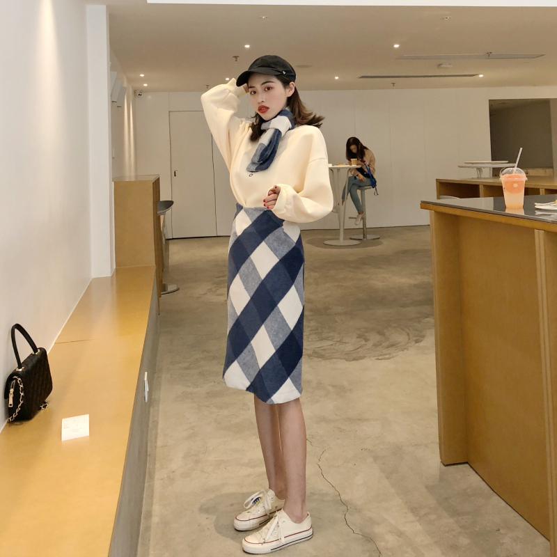 / chic百搭刺繡字母加絨衛衣女秋冬新款+格紋圍巾+高腰毛呢半身裙女