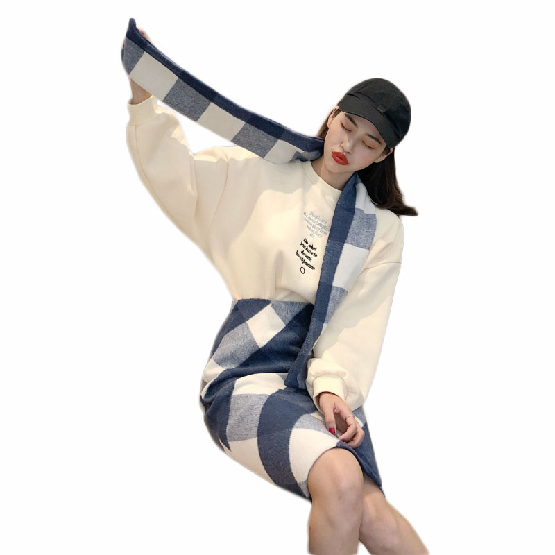 chic百搭刺繡字母加絨衛衣女秋冬新款+格紋圍巾+高腰毛呢半身裙女