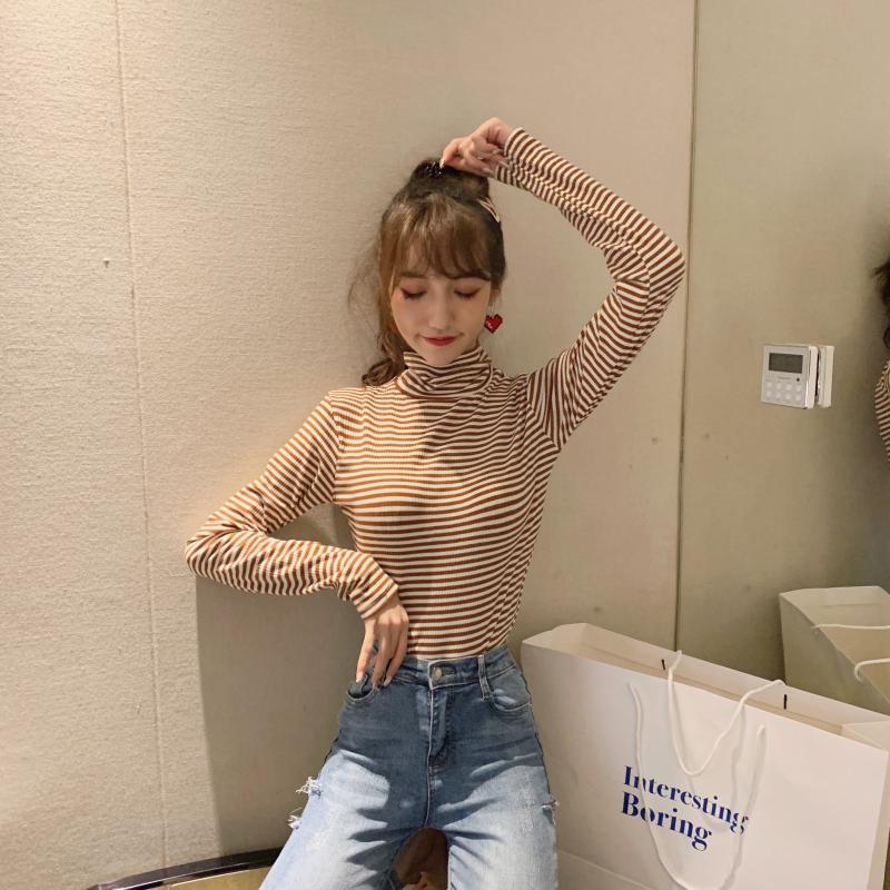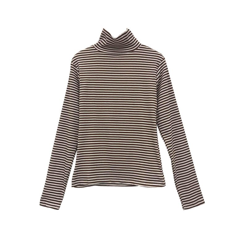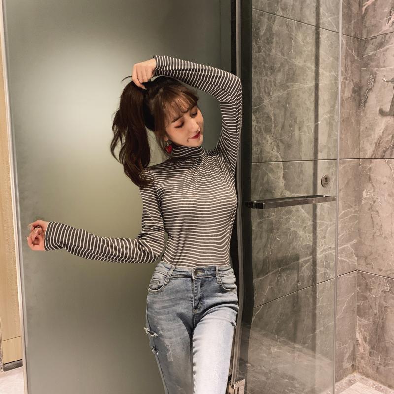 / 秋裝上衣復古chicT恤基礎款純色寬松百搭彈力高領條紋長袖打底衫