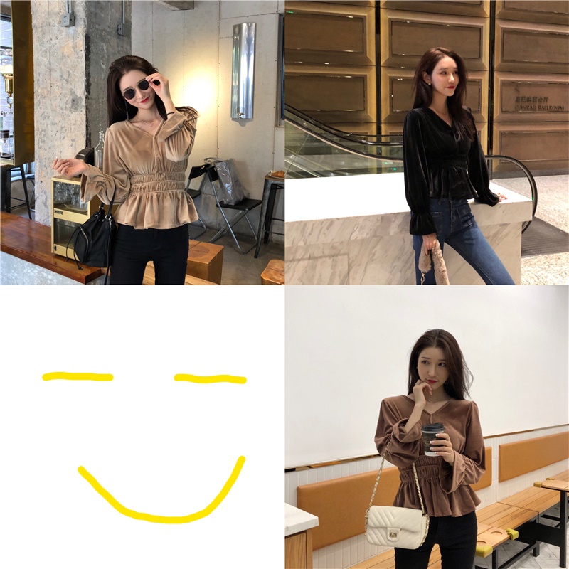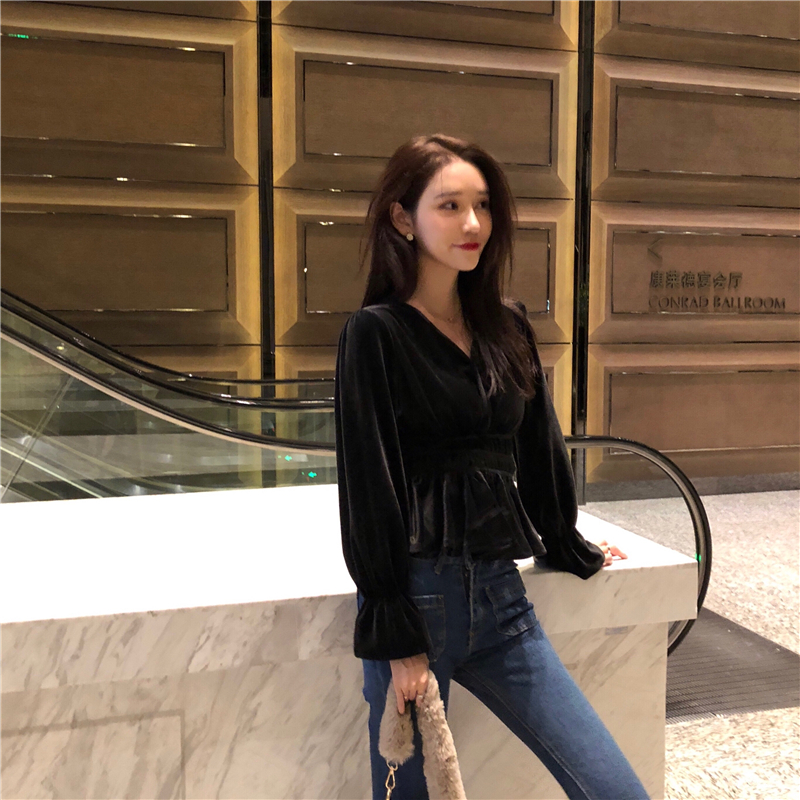 冬裝上衣女慵懶長袖t袖女韓版V領甜美金絲絨收腰百搭氣質打底衫女