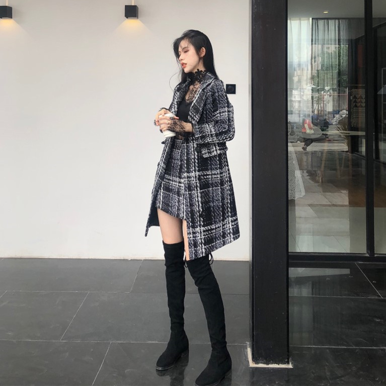 / 秋裝女2018新款格子西裝外套半身裙女+長袖針織衫+長袖網紗三件套