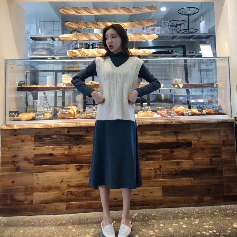 復古女神套裝秋冬新款百搭毛衣背心+針織高領打底+高腰一步針織裙